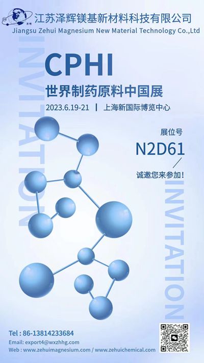2023年6月19~21日,江苏泽辉镁基与您相约世界制药原料中国展,期待您的光临,我们不见不散!